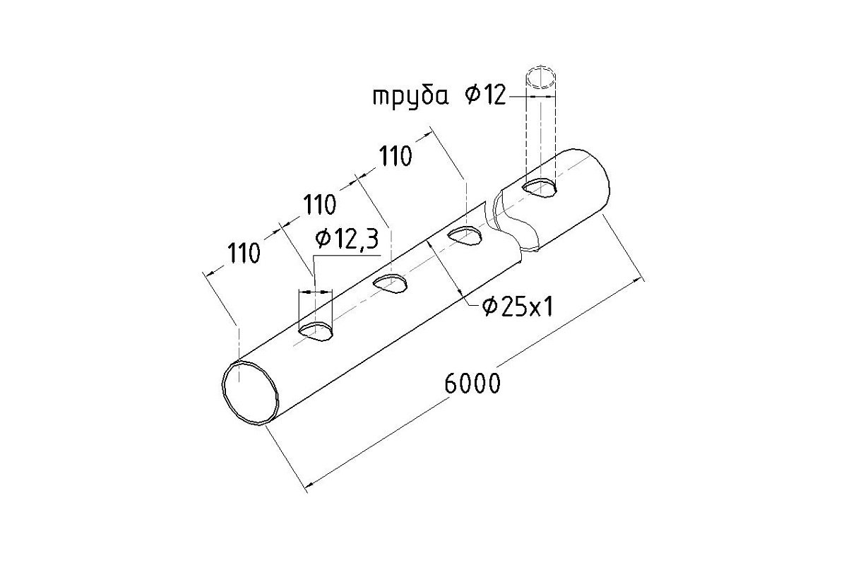 В конструкции предусмотрены овальные отверстия. Марка стали: AISI 304 — устойчива к коррозии, подходит для эксплуатации в условиях повышенной влажности. Размеры: 25 мм (наружный диаметр) × 1 мм (толщина стенки) × 6000 мм (длина). Перфорация: отверстия Ø12 мм с шагом под углом 30°. Обработка поверхности: GRIT 600 — полированная.