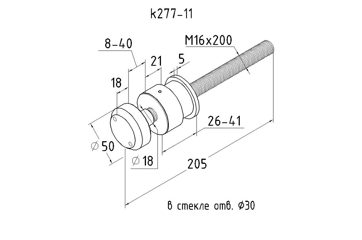 Комплект торцевого крепления несущего стекла, шпилька М16 AISI304, гайка-шайба Ø50х10мм, с регулировкой вылета 25-39мм, полированный, AISI 304 k277-11