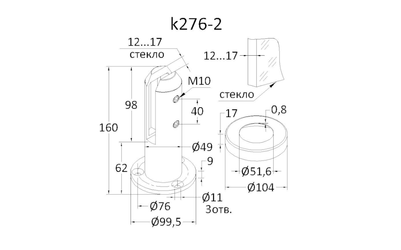 Стеклодержатель литой, напольный, Ø50.8х160 мм, стекло 16 мм, полир. (AISI 304) k276-2