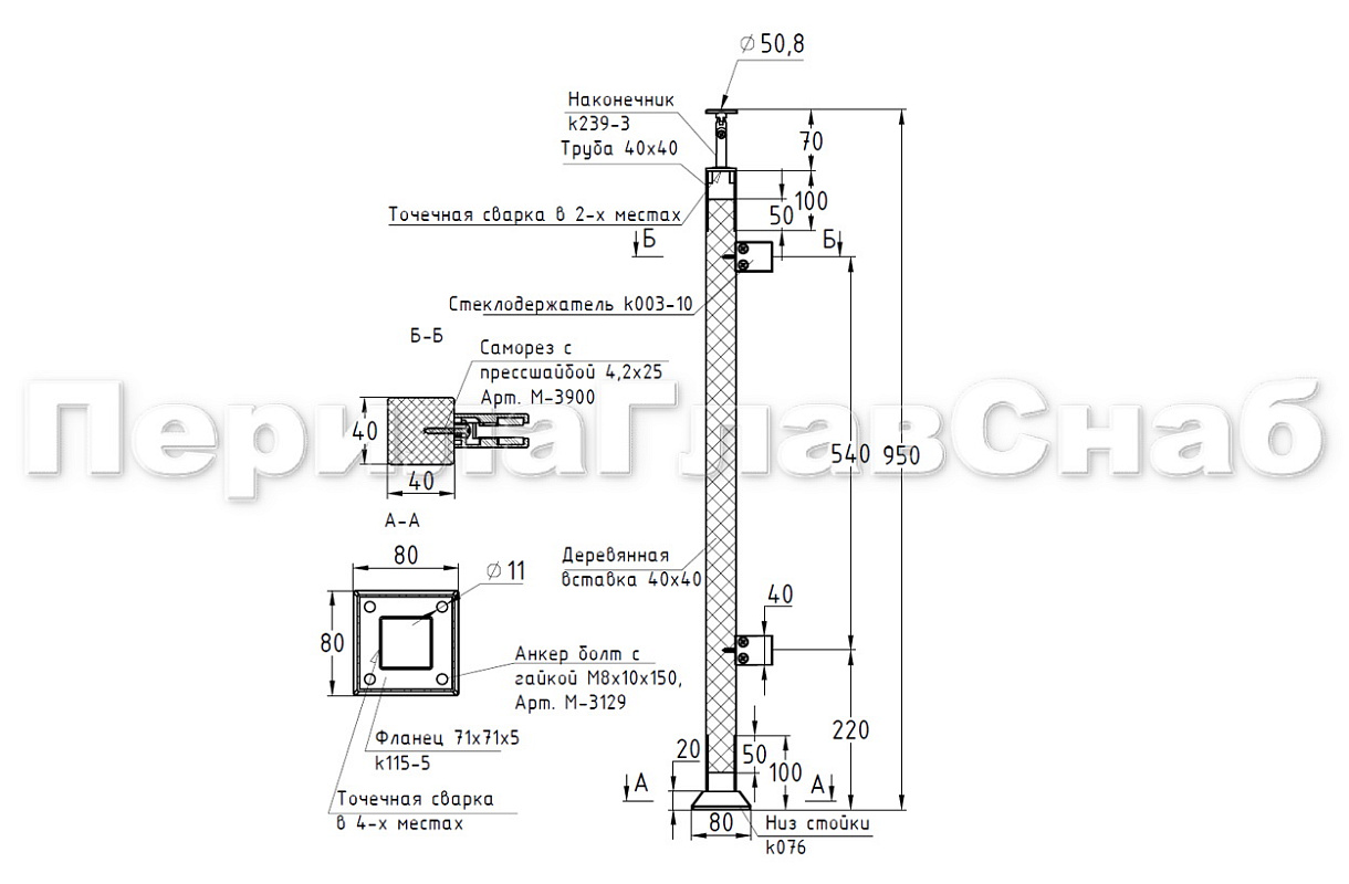 Готовая стойка 40х40х950 мм, деревянная, со вставками из нержавеющей стали 2х100 мм с 4 зажимными стеклодержателями k740-3 купить в Волгограде