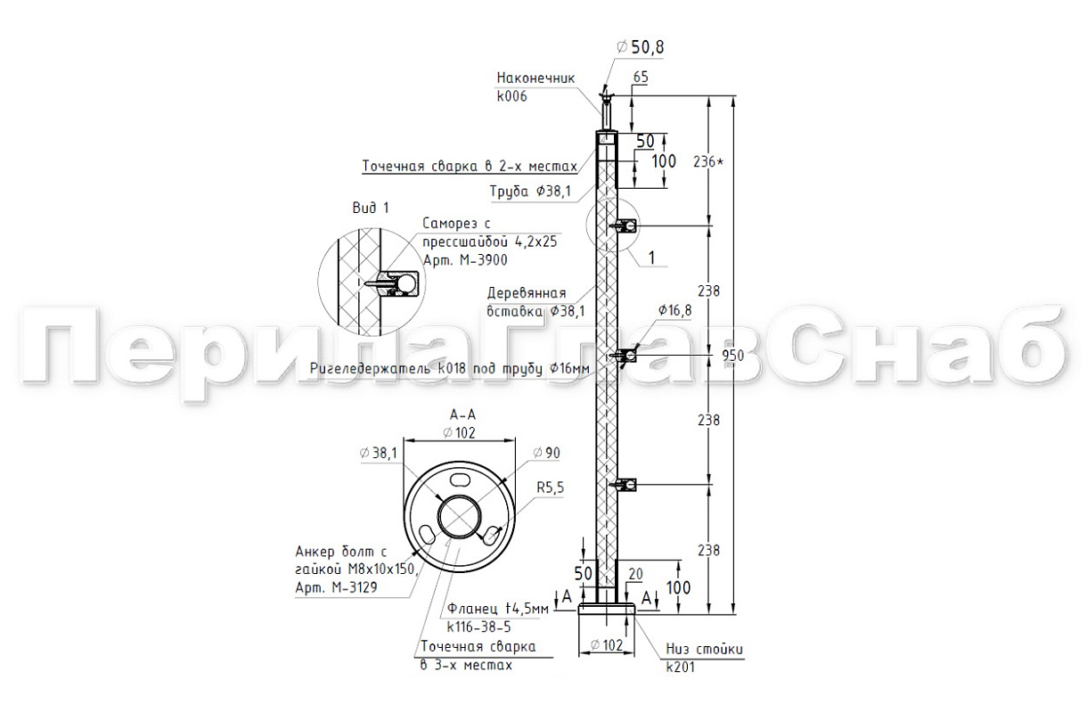 Готовая стойка Ø38,1 мм, с фланцем и наконечником, высота 950 мм, полированная (AISI 304) k702 купить в Волгограде