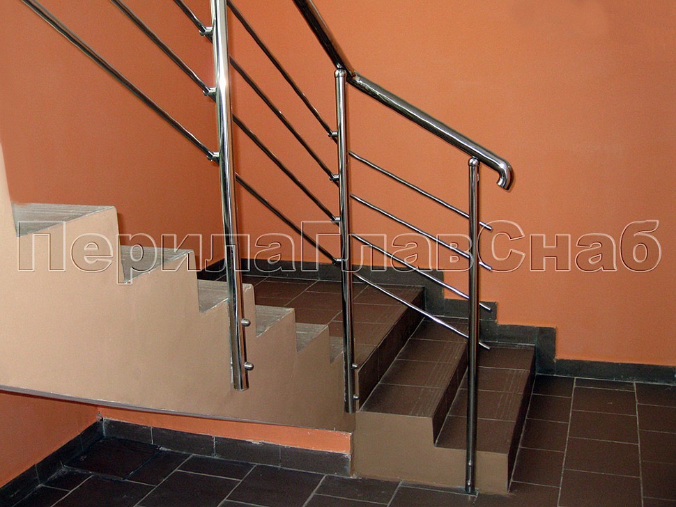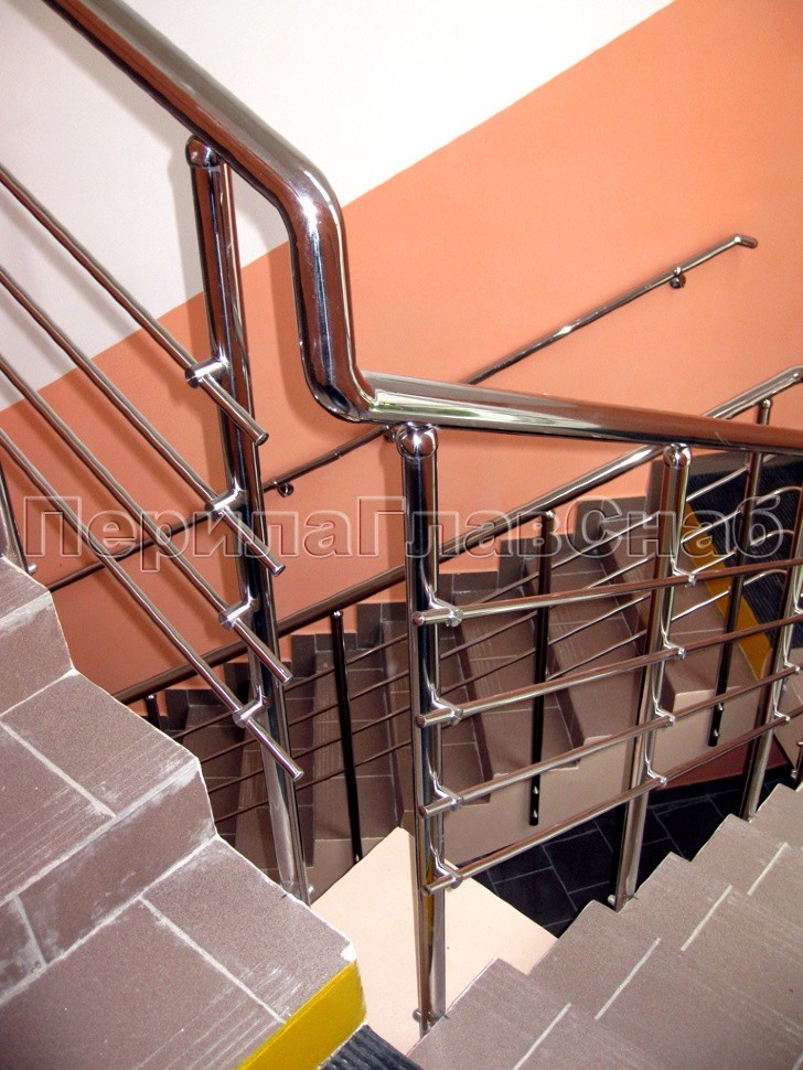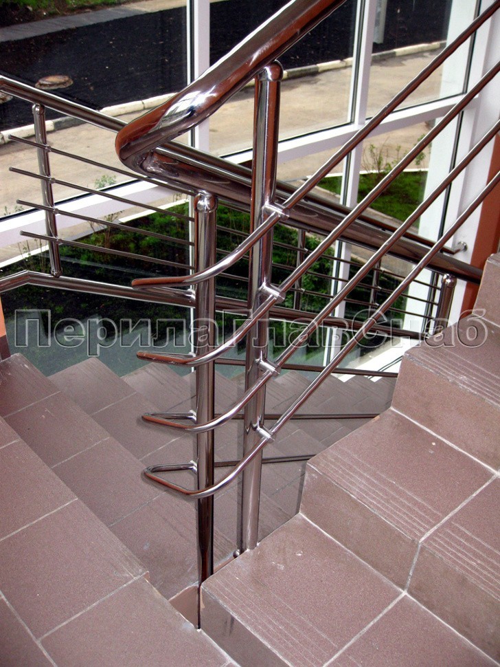 Перила из нержавейки вдоль окна и лестничного марша.Слева ограждение окна, а справа ограждение лестницы.Характерной особенностью ограждения окна является тот факт, что у него сразу два поручня.Верхний поручень служит для утилитарной и вполне традиционной цели — опоры руки идущего по лестницы человека. А вот второй (нижний) поручень нужен для опоры несущих стоек ограждения, так как они завязаны не в пол, как это делают обычно, а в стены. Таким образом, ограждение как бы «парит» в воздухе, создавая иллюзию легкости и воздушности всей конструкции в целом.