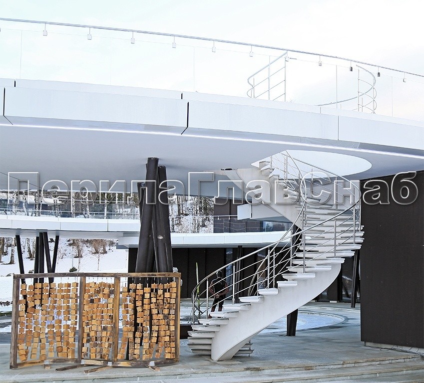 Ограждение винтовой лестницы из нержавеющей стали. Ограждение второго этажа на несущем стекле с поручнем на выносных стеклодержателях.