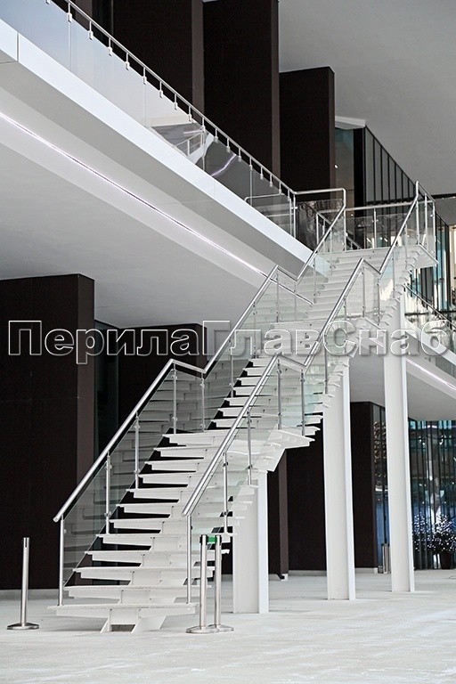 Ограждение лестницы со стеклом на зажимных стеклодержателях. Стойки с креплением в ступень с декоративными крышками.