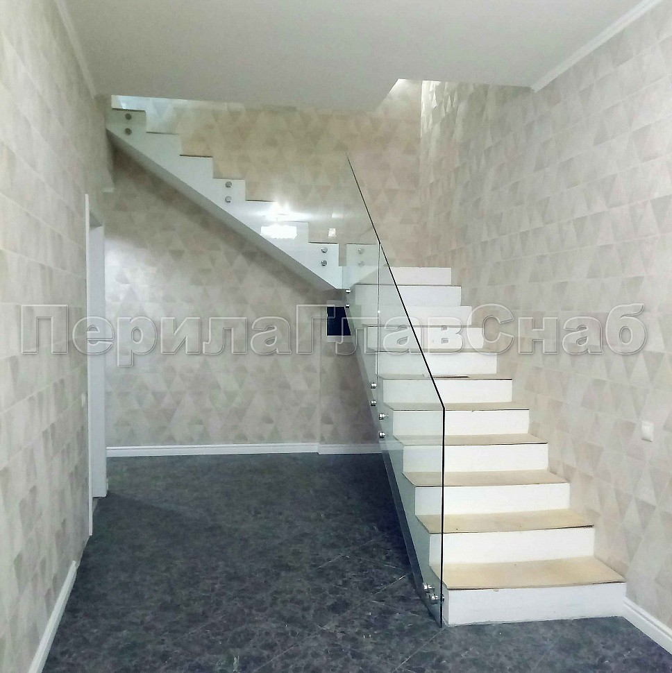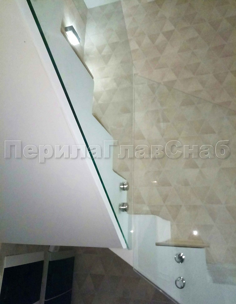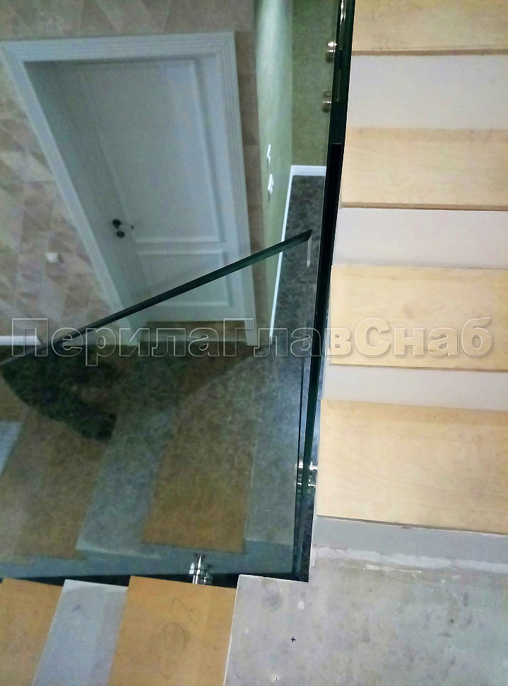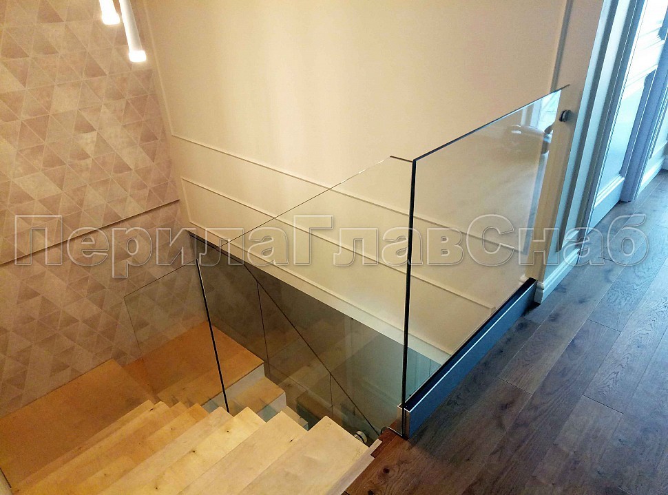 Лестница со стеклянным ограждением без стоек и торцевым креплением.