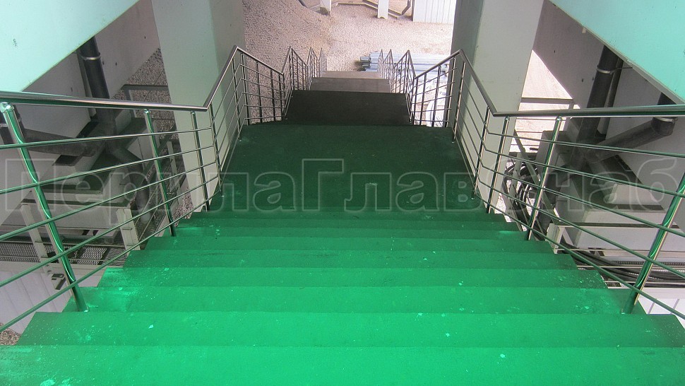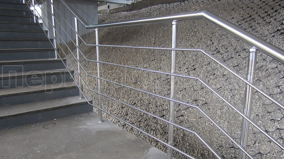 Компание ПерилаГлавСнаб были установленны отбойники на витражи из полированной нержавеющей стали. Труба диаметром 50мм устанавливается в два ряда на высоте 900мм и 1000мм и крепится к вертикальному импосту витража на саморезы через фланцы, изготовленные из листа 1,5мм. Гнутые выносные элементы из прутка 10мм привариваются к фланцам и трубе, сама труба завязана на поворотакх, ее окончание исполнено в форме “бублик”. Крепление нержавеющих элементов между собой произведено при помощи аргонно-дуговой сварки, с последующей зачисткой и полировкой.