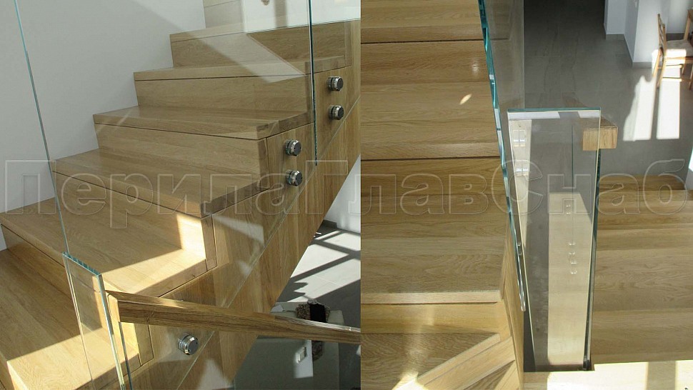 Заказ в частный дом на проектировку и установку цельностеклянных ограждений. Объект- двухмаршевая лестница и площадка. Всего было установлено 7 погонных метров ограждений. Каленое стекло оптивайт закреплено на боковых стеклодержателях к лестнице, толщина стекла- 10мм. Сверху на стекло установлен лакированный поручень из массива дуба. Между маршами также была установлена стеклянная перегородка, призванная обезопасить жильцов дома помладше. Поручень выполнен в тех же тонах, что и сама лестница, что придает общей конструкции гармоничный вид, а золотой цвет дуба создает визуальную легкость и отлично вписывается в светлый интерьер дома.