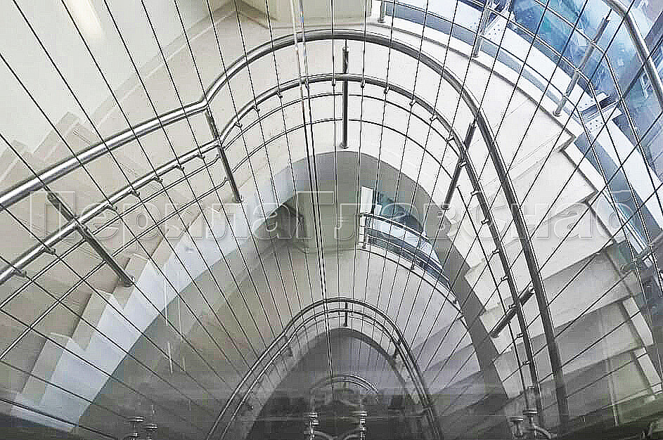 Тросовые ограждения на лестницу и площадки в жилой дом со 2 по 7 этаж из шлифованной нержавеющей стали с 2 - мя ригелями. Хочется отметить вертикальное тросовое заполнение, которое делает ограждения более безопасными в эксплуатации.