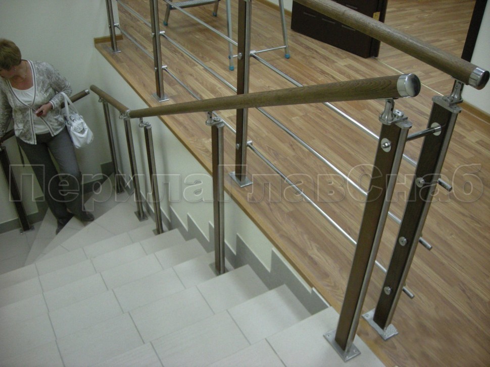 Четыре ригеля на держателях, квадратный деревянный поручень и квадратные стойки