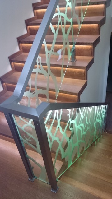 Ограждение с профильным поручнем с пазом на точечном креплении на лестнице