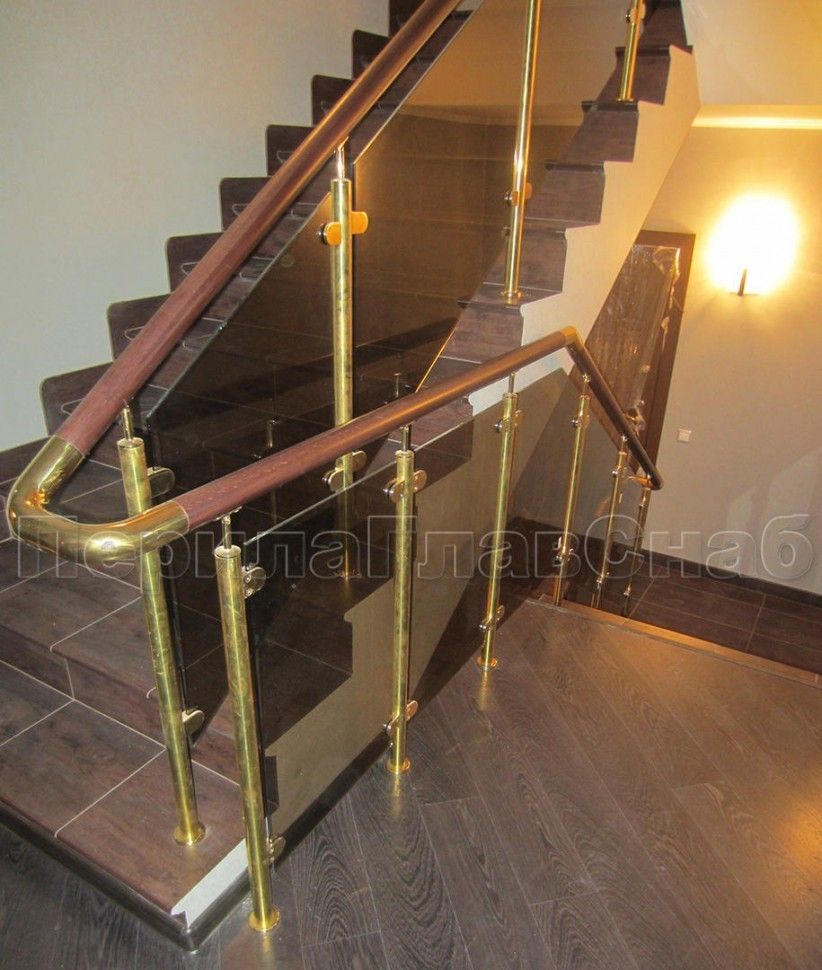 - Ограждение лестницы с прозрачным стеклом, стойками и поручнем из латуни