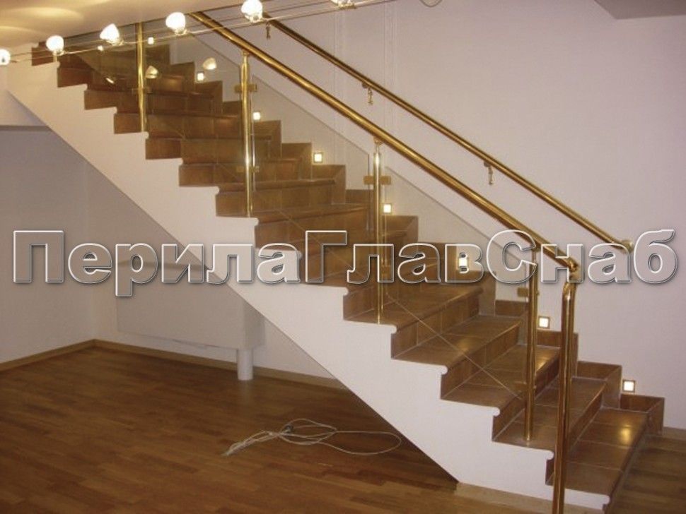 - Ограждение лестницы со стеклом, тонированным в массе, стойки и завязки поручня из латуни