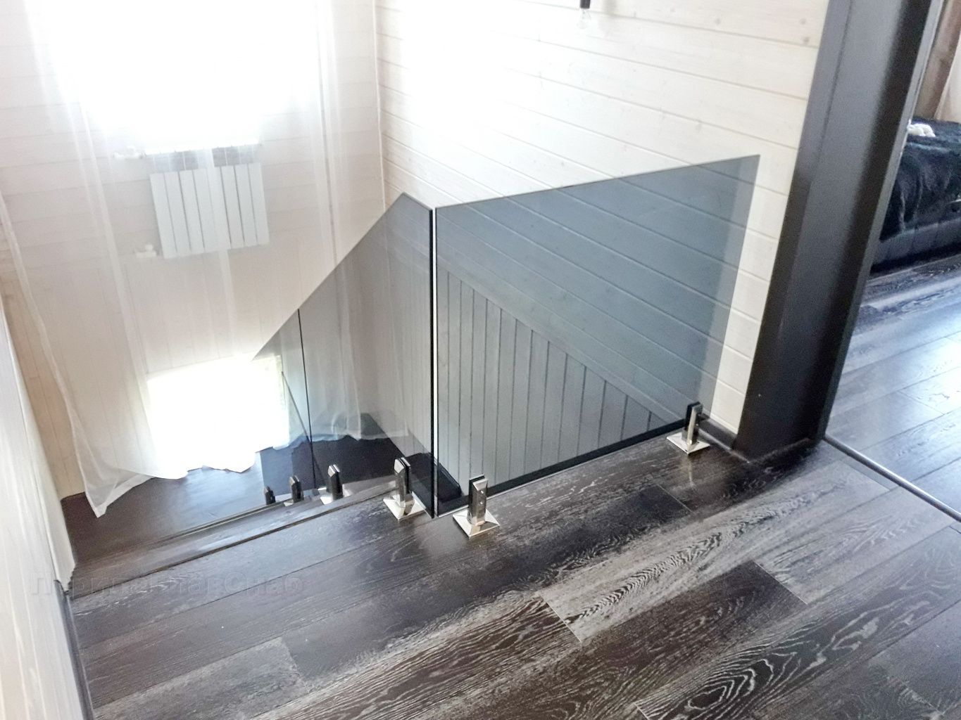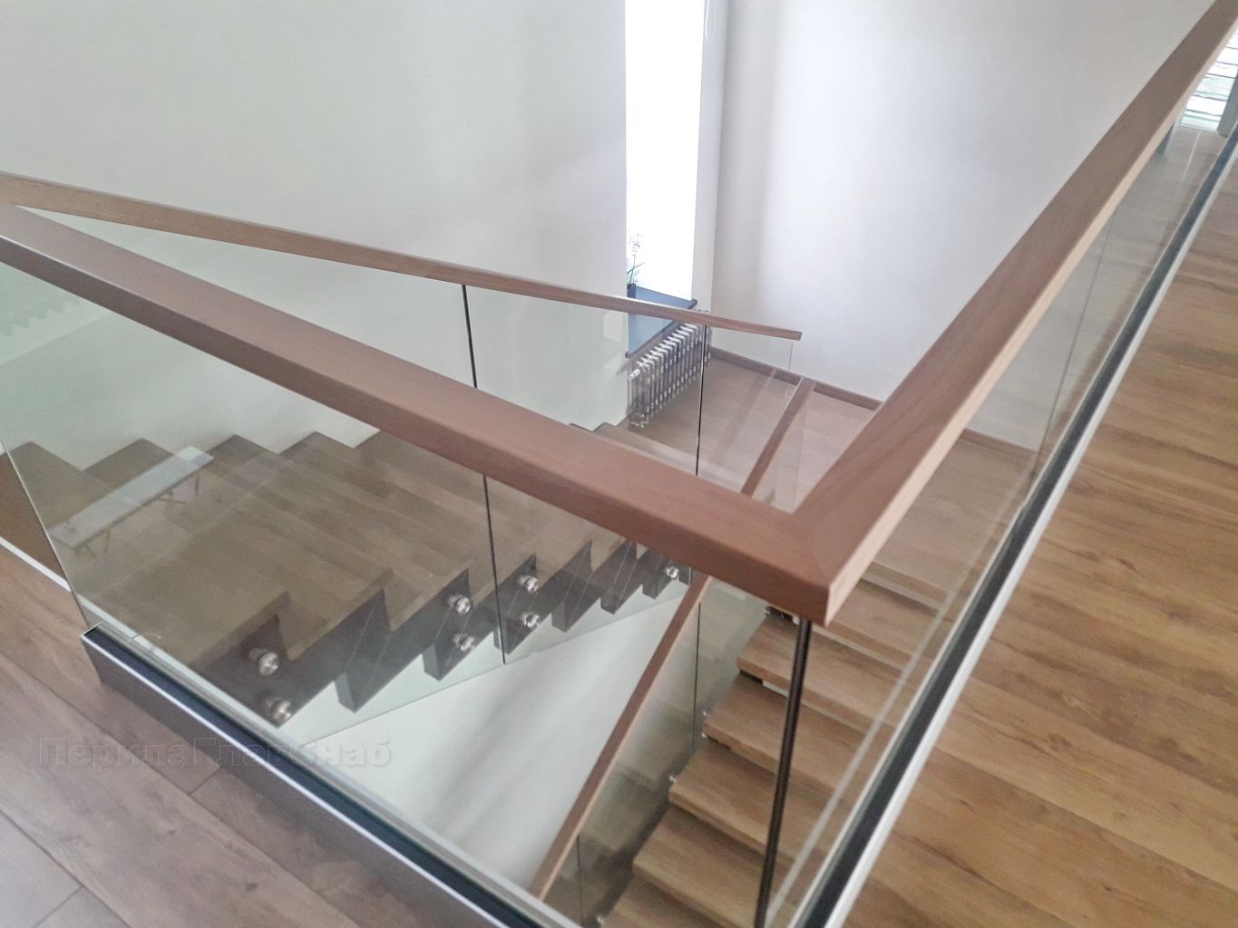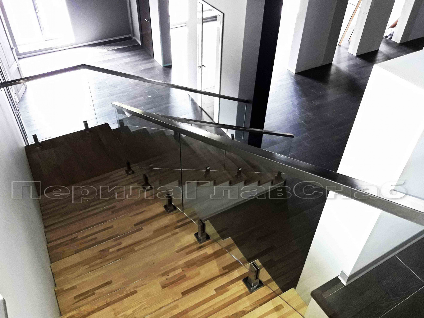 Ограждение лестницы с квадратными стойками и пластинчатыми стеклодержателями