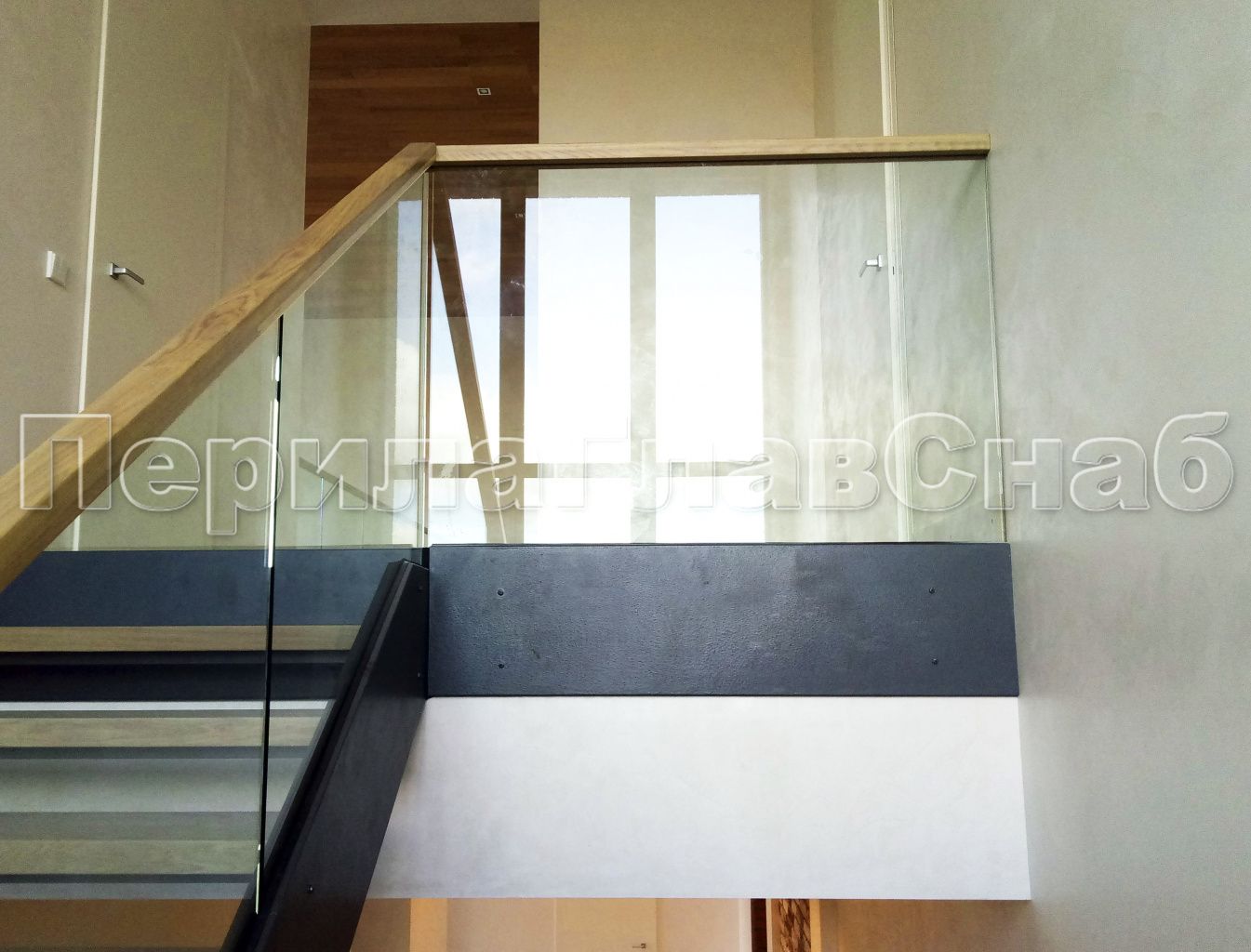 Ограждение с деревянным поручнем с зажимными стеклодержателями и стойками