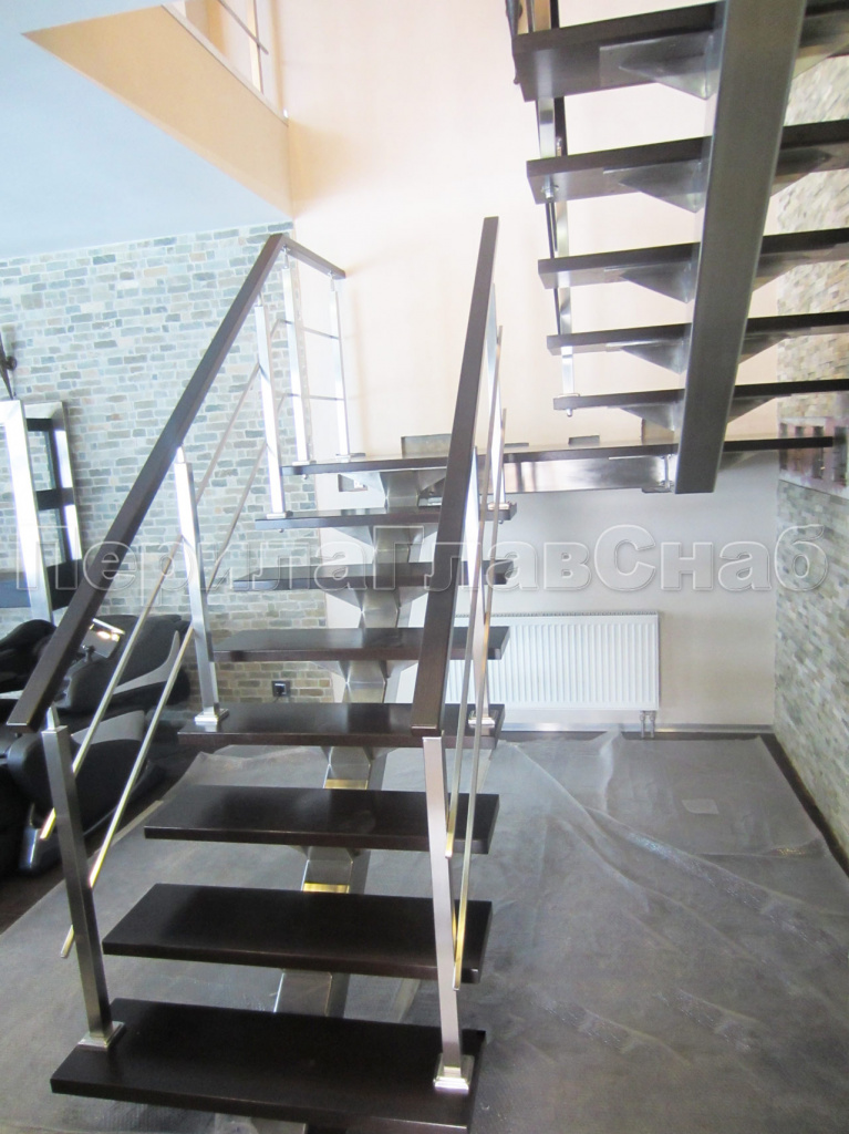 Ограждение лестницы на квадратных стойках с латунным поручнем